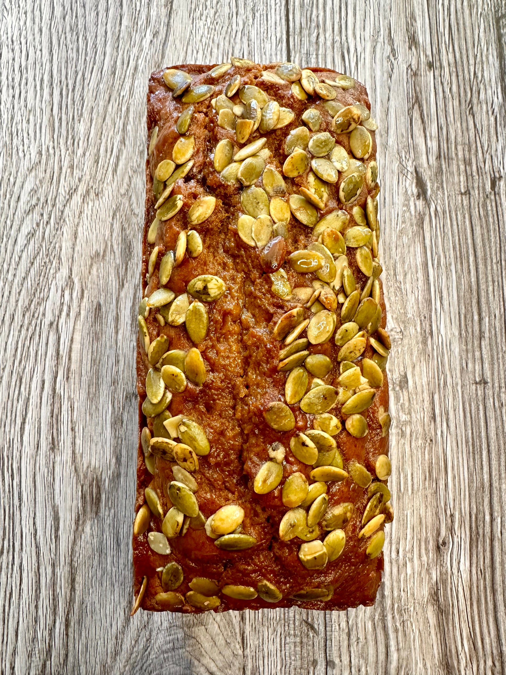 Ingredients: Pumpkin puree, Sonora wheat flour, brown sugar, eggs, butter, vanilla extract, baking powder, whole milk, maple syrup, pumpkin seeds , pumpkin pie spice, cinnamon, sea salt.